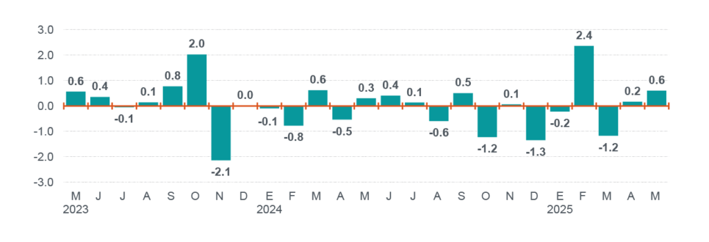 Durante mayo de 2025, el IMAI registró un crecimiento mensual de 0.6 %, alcanzando un nivel de 103.3 puntos (base 2018=100). Sin embargo, en comparación con el mismo mes del año anterior, el indicador general cayó ligeramente, arrastrado principalmente por desempeños negativos en los sectores de minería y energía.